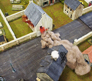 The battle for Le Port raged on into the afternoon session, with new players picking up a continuation of the scenario as the German counter-attack starts for real. Le Port seemed to be taking quite some damage in the heavy fighting, as evidenced by this dramatically blazing cottage: